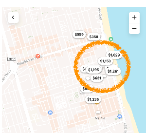 아래 에어비엔비 검색 결과를 보면 매우 많은 포스팅들이 비슷한 부분에 밀집되어 있는걸 볼 수 있다. 에어비엔비에 리스팅을 할 때에는 정확한 주소를 입력하지 않기 때문에 대략적인 위치에 리스팅들이 보여지게 되는데 이 지역에 있는 대부분의 리스팅들이 같은 건물의 다른 집들이라는 걸 볼 수 있다.