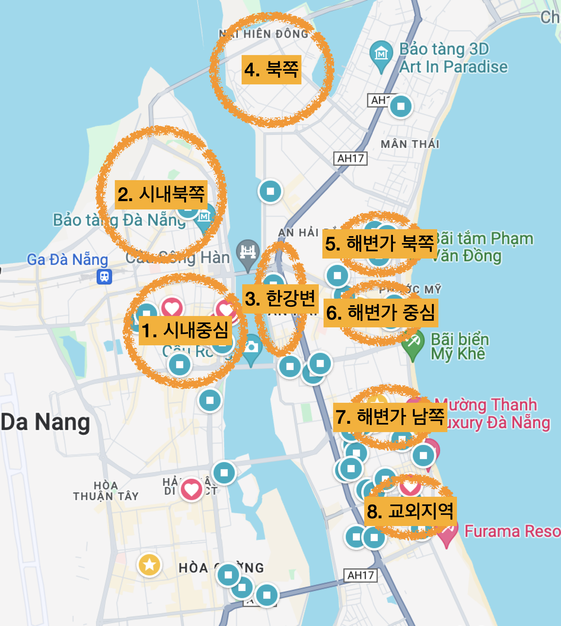 2. 시내 북쪽 - 시내에서 약간 떨어진 곳에서 다낭 현지 사람들의 모습을 더 가까이 느낄 수 있는 곳이라고 한다. 관광객들보다 로컬들을 위한 맛집과 카페들이 많다.