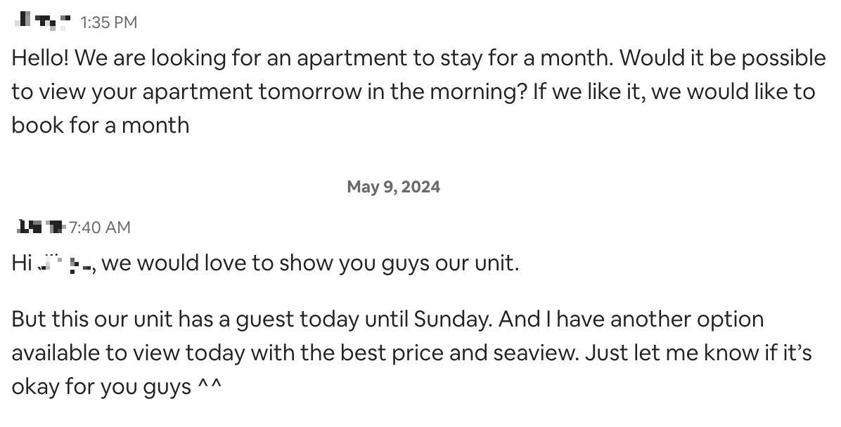 다낭에 도착하기 일주일 정도 전부터 맘에 드는 숙소를 골라놓고, 에어비엔비 호스트들에게 메시지를 보내기 시작했다. 한달동안 살 계획인데 예약하기 전에 집을 먼저 볼 수 있을까요? 대부분의 호스트들은 친절히 와서 보고 가라고 안내를 해주고, 며칠 몇시에 만날지 집 보는 약속을 잡아줬다. 실제로 다낭에 도착했을 때 예약이 이미 완료된 숙소들을 제외하고도 10군데 정도 숙소를 보러갈 수 있었다.