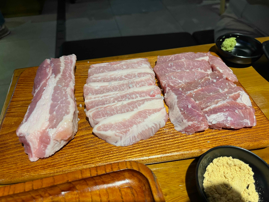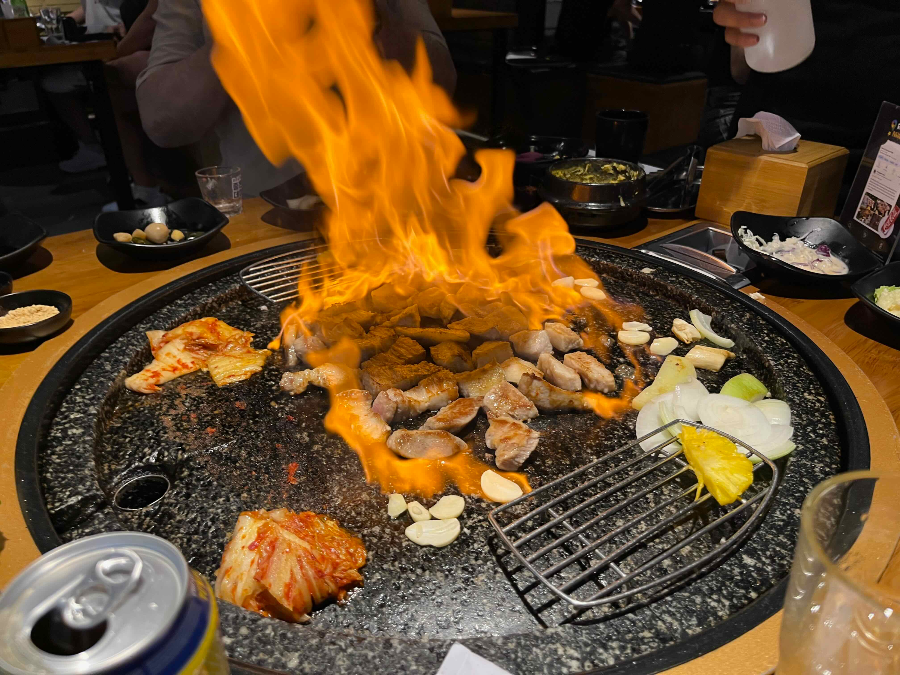우리는 삼겹살, 항정살, 가브리살을 시켰는데 다 너무 맛있었다.ㅎㅎ 직원들이 처음부터 끝까지 다 먹기좋게 구워주신다. 삼겹살엔 당연히 김치!! 김치도 맛있다.. 새콤새콤해서 삼겹살 기름에 구워놓으면 딱 맛있는 김치! 다 구워졌을 때 쯤 기름 뿌리고 불쇼까지!! 보는 재미도 쏠쏠하다ㅋㅋ