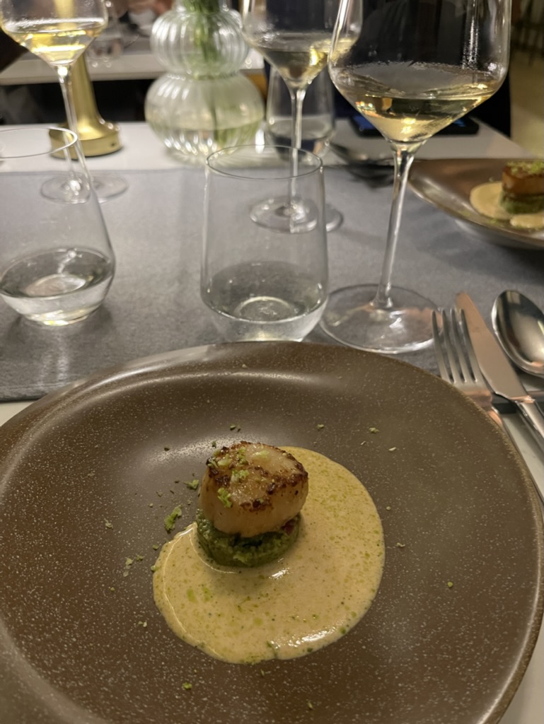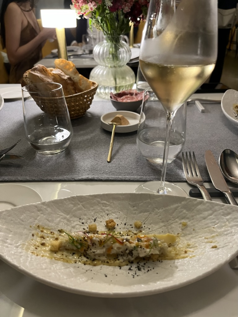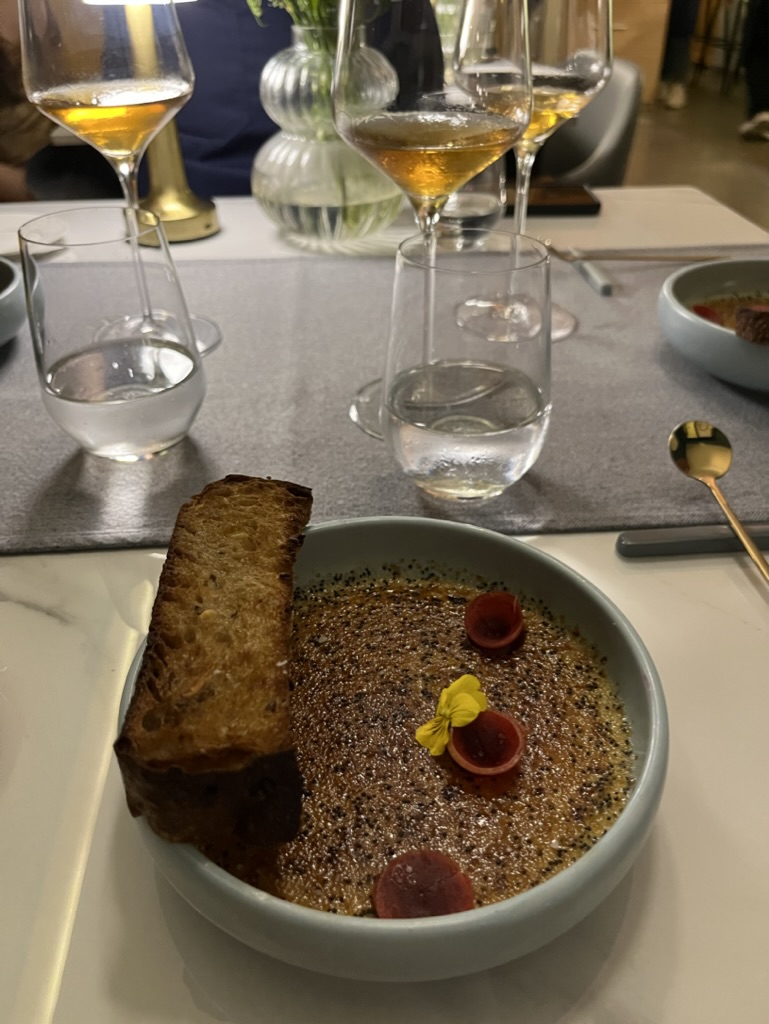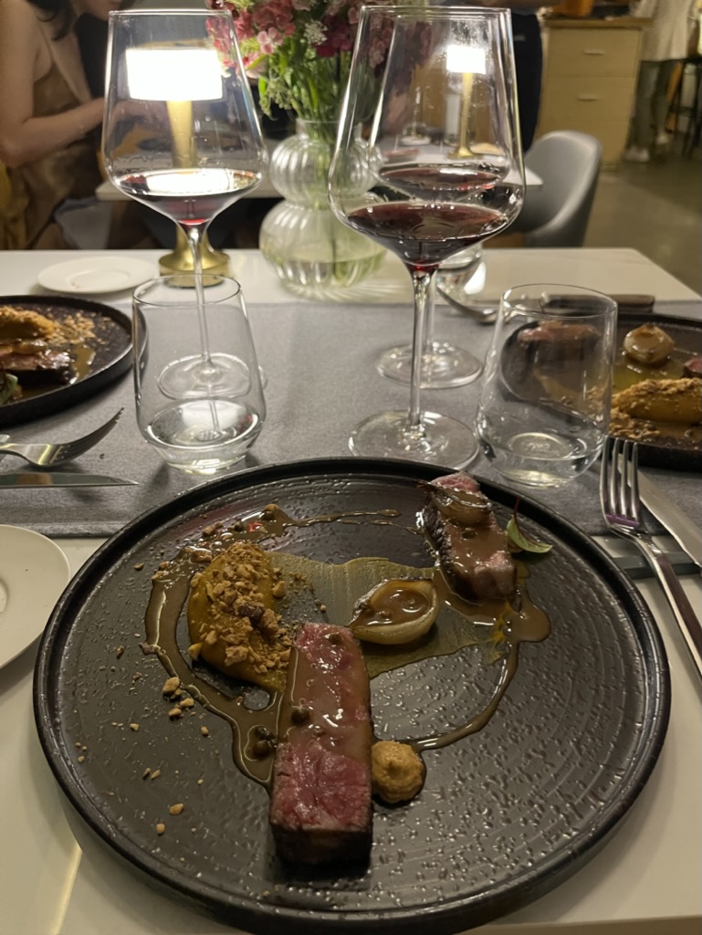 모든 코스요리마다 너무 맛있었지만, 와인페어링이 특히 좋았다. 와인을 함께 곁들일때 풍미가 훨씬 더 살아나기도 하고, 입맛을 정화시켜주기도 하고, 무엇보다 즐거운 저녁시간을 더 즐겁게 해주는 와인! 가장 맛있게 먹었던 요리는 푸에그라 크림 브륄레였다. 푸에그라의 고소한 맛과 카라멜화 된 설탕의 바삭하며 달콤한 맛이 너무나도 잘 어울렸다. 여기에 살짝 발효된 오렌지 와인의 풍미까지!!