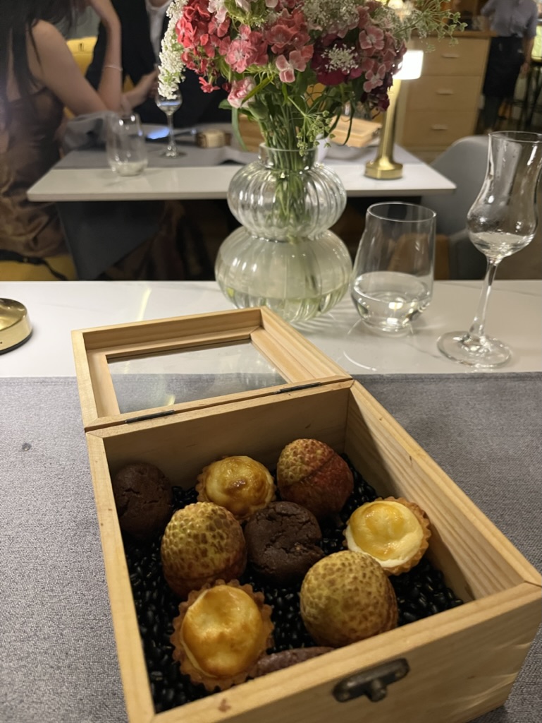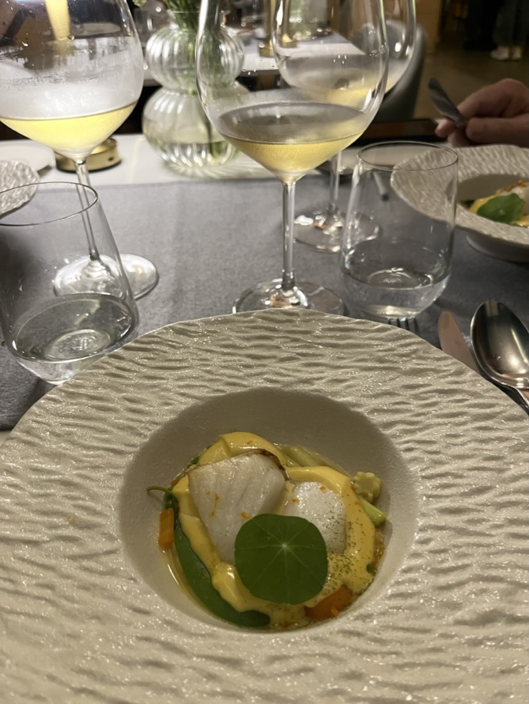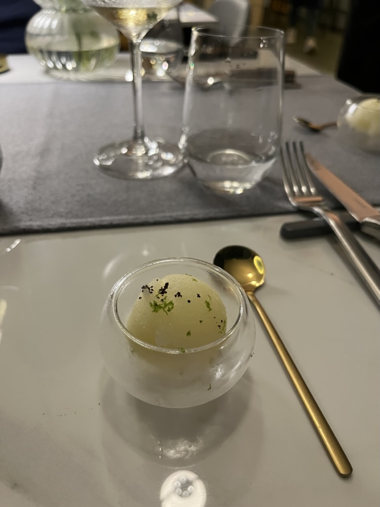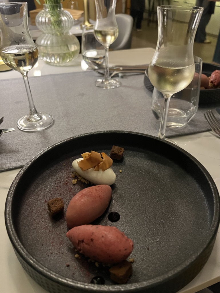 모든 코스요리마다 너무 맛있었지만, 와인페어링이 특히 좋았다. 와인을 함께 곁들일때 풍미가 훨씬 더 살아나기도 하고, 입맛을 정화시켜주기도 하고, 무엇보다 즐거운 저녁시간을 더 즐겁게 해주는 와인! 가장 맛있게 먹었던 요리는 푸에그라 크림 브륄레였다. 푸에그라의 고소한 맛과 카라멜화 된 설탕의 바삭하며 달콤한 맛이 너무나도 잘 어울렸다. 여기에 살짝 발효된 오렌지 와인의 풍미까지!!