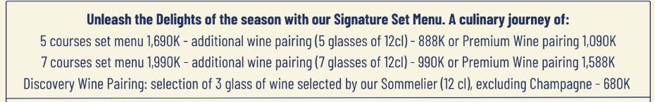 유럽의 미쉘린 레스토랑에서 일했던 남편 쉐프와 부인 소믈리에가 베트남 다낭에서 오픈한 프렌치 레스토랑이다! 프렌치 코스요리를 5코스 또는 7코스로, 코스별로 어울리는 와인 페어링과 즐길 수 있다. 가격은 5코스에 1,690k (+와인페어링 888k 또는 프리미엄 와인페어링 1,090k), 7코스에 1,990k (+와인페어링 990k 또는 프리미엄 와인페어링 1,588k)로, 2024년 6월 기준 환율로 10만원 근처 (+와인페어링 ~8만 5천원 이하)의 가격으로 프렌치 코스요리를 즐길 수 있다!! 메뉴는 주기적으로 바뀐다고 한다.