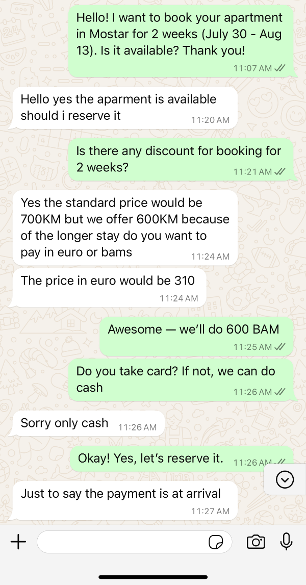 물론, 에어비앤비 같은 중개 플랫폼 없이 호스트와 직접 거래하는 것이기 때문에 막상 숙소에 도착하기 전날이 되니 살짝 걱정이 되기 시작했다..ㅋㅋ 혹시 사기는 아닐까.. 이런 생각들. 그러나 모스타르에 도착해서 만난 호스트는 너무나도 친절하셨고, 숙소는 사진보다도 더 깨끗하고 좋았다. 이 숙소에 머무는 외국인은 우리가 처음이라고 하신다ㅎㅎ 모스타르 기차역까지 픽업을 나와주신 호스트는 이렇게 저렴한 가격에 숙소를 빌려주시면서 택시비도 안 받겠다고 사양하셔서, 절대 안 된다고 손에 택시비를 들려서 보내드렸다.