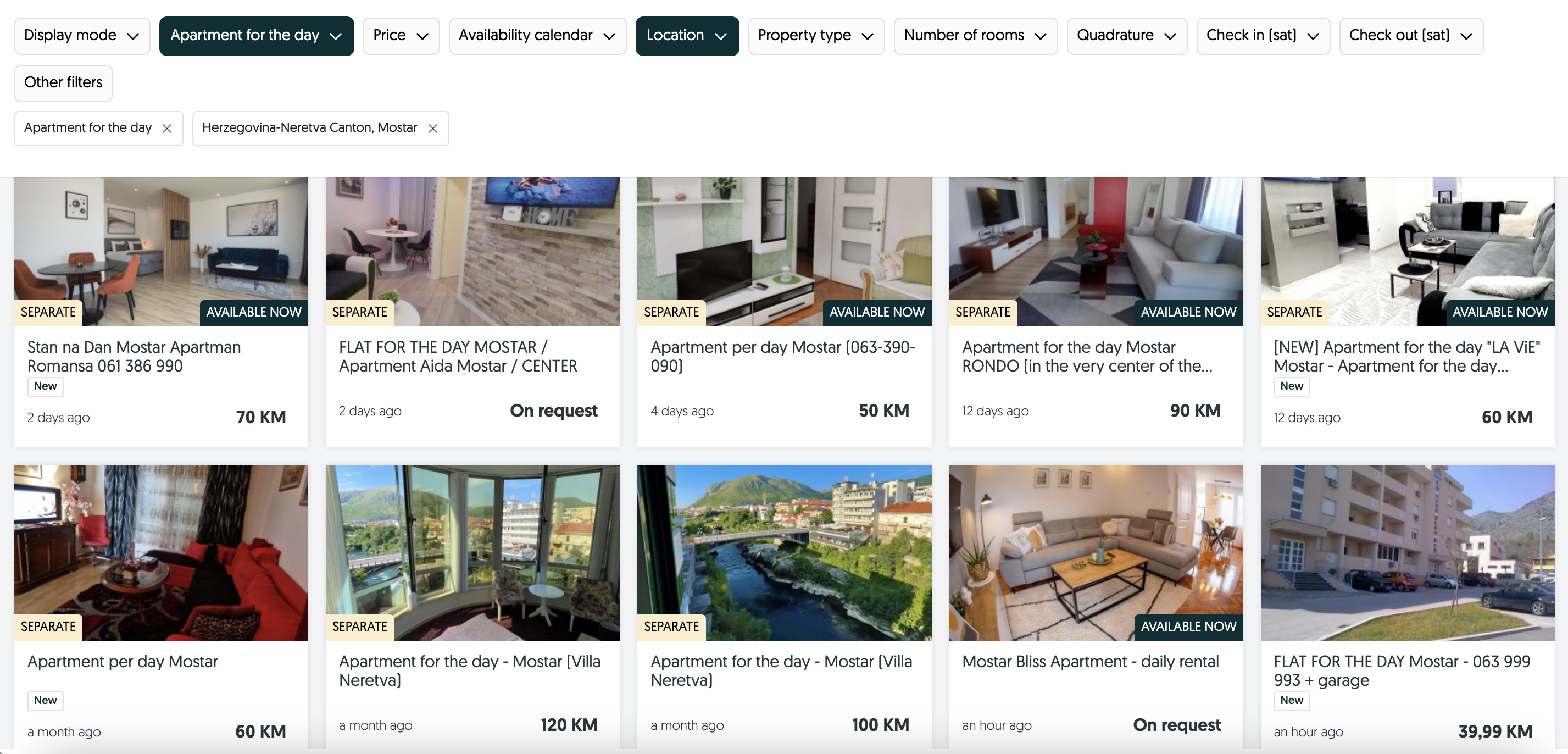 그러고 나서 모스타르로 넘어가기 직전에, 보스니아 현지 사람들이 사용하는 숙소 찾기 웹사이트를 찾았다!! 뭔가 이것저것 다 올라와 있는 옛날 중고장터 스타일의 웹사이트인데, 맙소사.. 숙소들 가격이 너무 착하다..! 깔끔하고 모던해 보이는 거실 + 1 베드 + 풀키친 아파트가 하루에 50KM (~25 USD) 라니.. 에어비앤비의 절반도 안 되는 착한 가격들이었다.