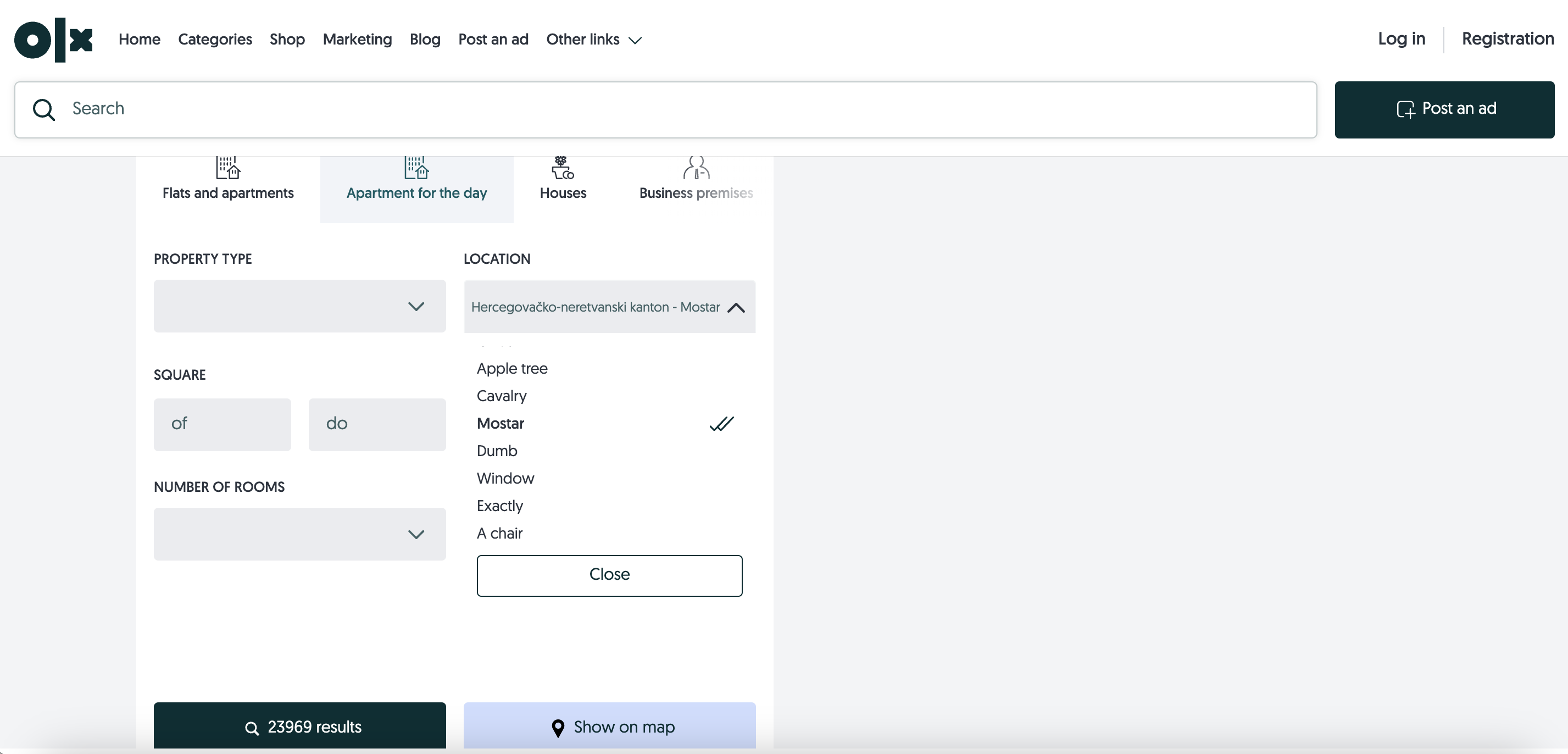 Real Estate 메뉴를 선택하면 다음과 같은 페이지가 나온다. 다음의 페이지에서는 Apartment for the day 하루단위로 렌트 가능한 아파트 메뉴를 선택해 준 뒤, 숙소를 구하고자 하는 도시를 선택해 준다. 아래의 페이지에는 우리가 이 웹사이트를 통해 숙소를 예약했던 도시인 모스타르가 선택되어 있다.