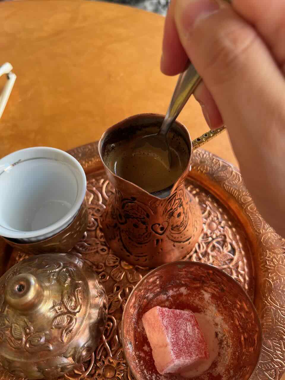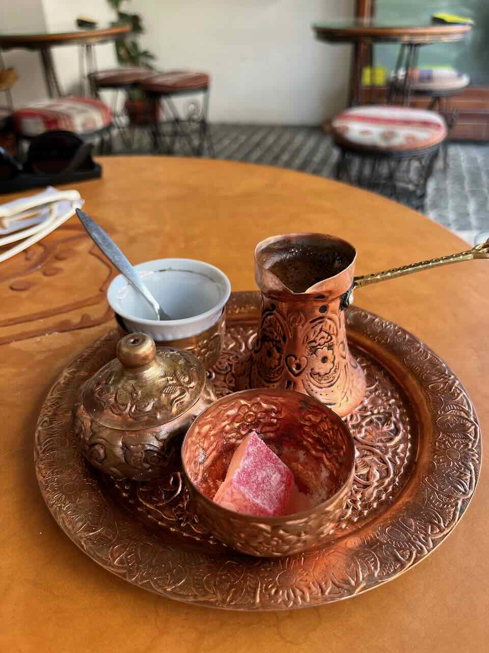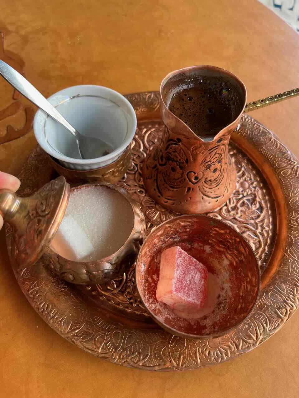 다른 곳에서는 찾아볼 수 없는 보스니아만의 커피를 즐기는 방식은 바로 각설탕을 커피에 찍어서 커피와 함께 먹는다는 점! 커피와 함께 나오는 각설탕을 마치 쿠키를 우유에 찍어먹듯이 커피에 찍어먹는다! 이렇게 커피에 적셔준 각설탕을 먼저 입에 베어 물고 커피를 마셔준다. 이렇게 하면 설탕과 커피의 달고 쓴맛을 함께 즐길 수 있다. 커피 없이 마셔본 보스니아 커피는 상당히 강하고 쓴맛이었다. 그리고 함께 나오는 달달한 젤리같은 라하틀로쿰은 아무때나 입맛에 맞게 함께 먹어준다.