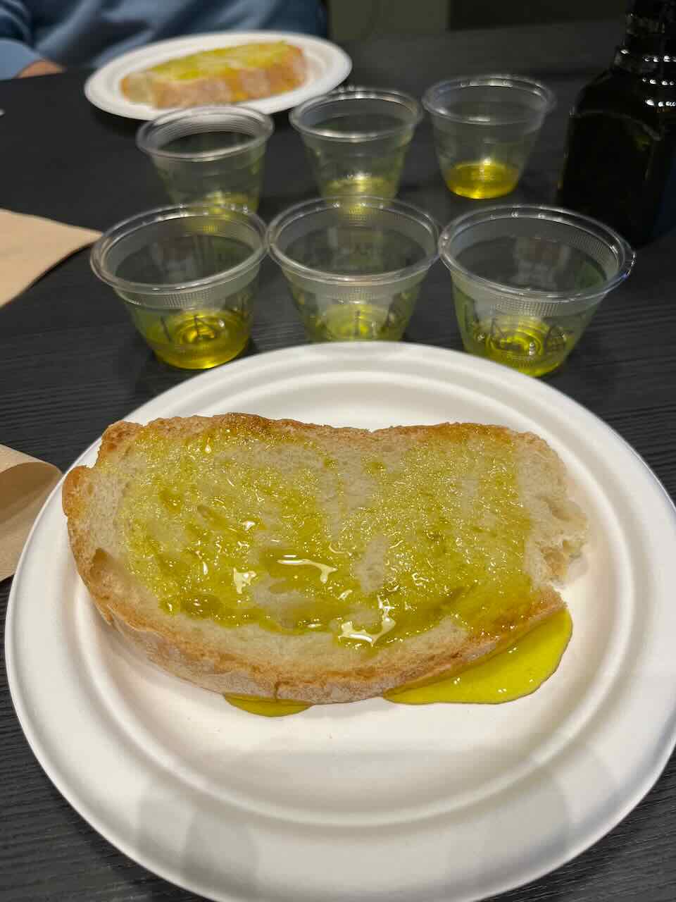 엑스트라 버진 올리브 오일을 빵에 적셔 먹으면 또 다른 맛과 풍미를 감상할 수 있다. 같아 보이지만 사실은 다른 올리브 오일들로 반반 적셔진 테이스팅용 빵과 오일들ㅎㅎ 오일만 테이스팅할 때와는 다른 올리브의 풍미를 느낄 수 있다.