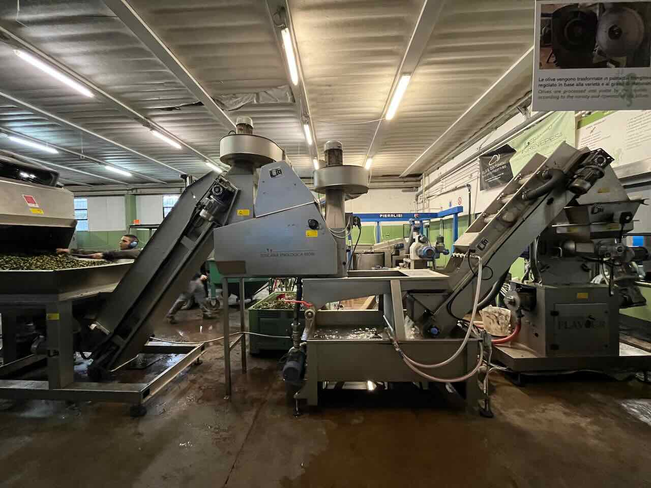 깨끗하게 세척된 올리브 열매들은 분쇄과정을 통해 올리브 페이스트로 만들어진다. 올리브 페이스트를 만들기 위해 전통적으로는 대형 돌 멧돌을 사용했다고 한다. 현대에는 스테인리스 스틸 분쇄기가 멧돌의 역할을 대신하고 있다. 분쇄 과정에서는 올리브 열매의 껍질과 씨를 포함한 올리브 열매의 모든 부분을 함께 분쇄한다! 안그래도 참기름과는 다르게 올리브 열매에는 단단한 씨가 있어서 이걸 어떻게 처리할까 궁금했었는데, 기름 추출 전에 올리브 페이스트를 만드는지는 전혀 몰랐다..!