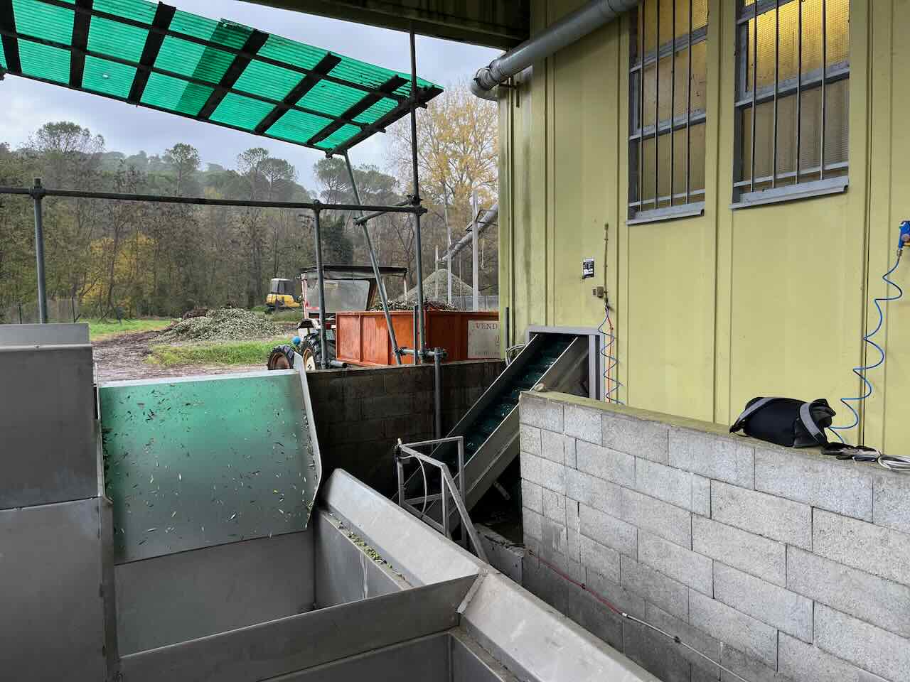 농장에서 트랙터로 운반된 올리브들은 올리브 나뭇가지와 올리브를 구별해내는 장치로 보내진다. 아래 사진 저~~ 뒤쪽에 보이는 산더미같은 것들이 바로 분류되어 따로 모아진 올리브 나뭇가지들이다. 이렇게 골라진 나뭇가지들은 좋은 비료로 사용된다고 한다.