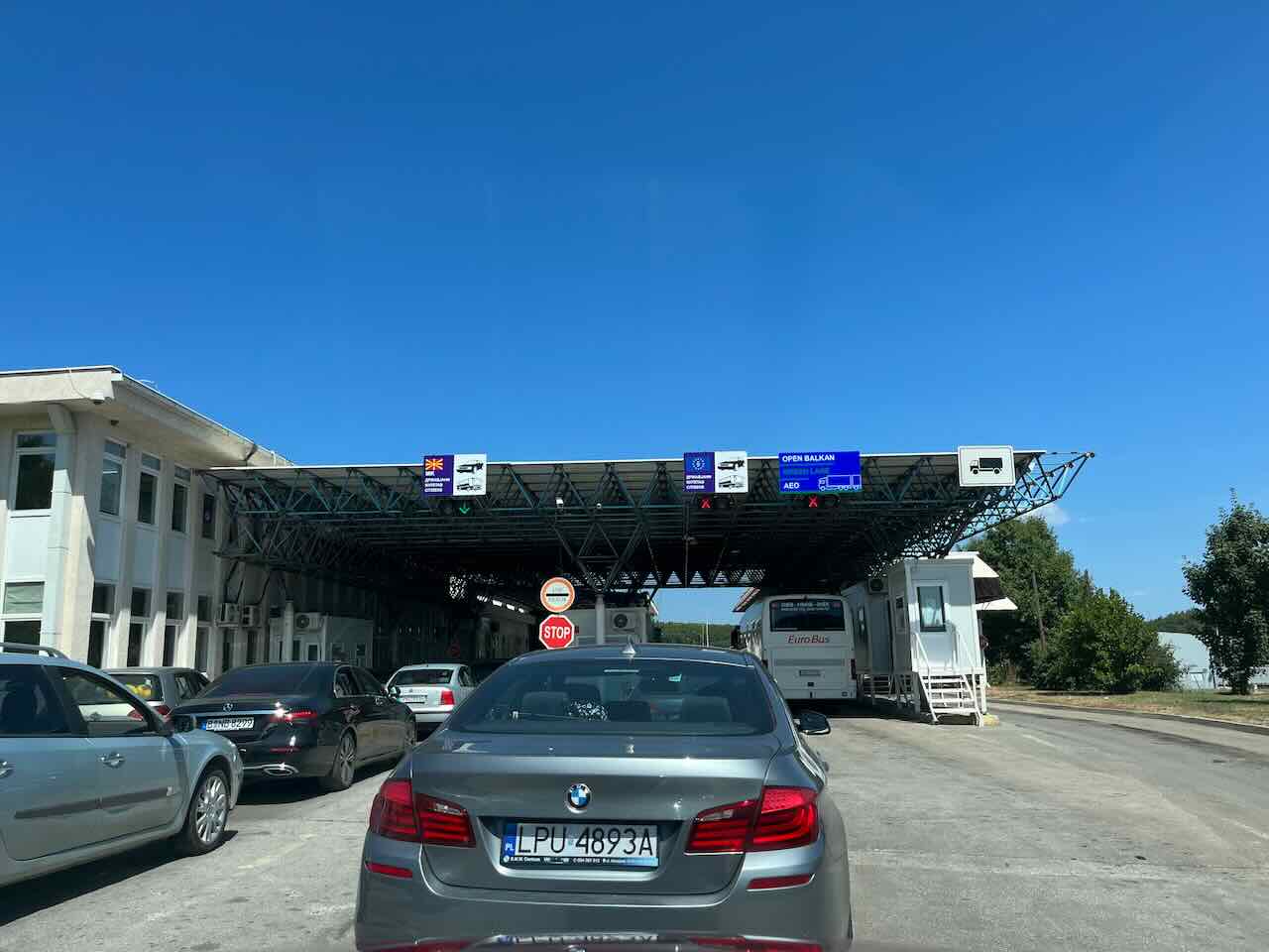 알바니아에서 북마케도니아로 넘어가는 첫번째 게이트를 통과하고 나면, 북마케도니아와 유럽연합 국기가 그려져 있는 두 번째 게이트가 진짜 국경 통과 지점이다. 국경을 통과하기 위해서는 여권과 자동차 문서 (렌터카 회사에서 제공해주는 국경 통과 패스, 구입한 그린카드, 그리고 렌터카 계약서)를 제출하면 된다. 딱히 질문도 안 하고 추가적으로 확인하는 것도 없는 간단한 국경 통과였다. 우리는 주말이어서 차가 꽤 많은 편이었는데도 불구하고 알바니아에서 북마케도니아로, 그리고 북마케도니아에서 다시 알바니아로 돌아오는 양쪽 국경을 통과할 때 각각 10분 이상 걸리지 않았다.