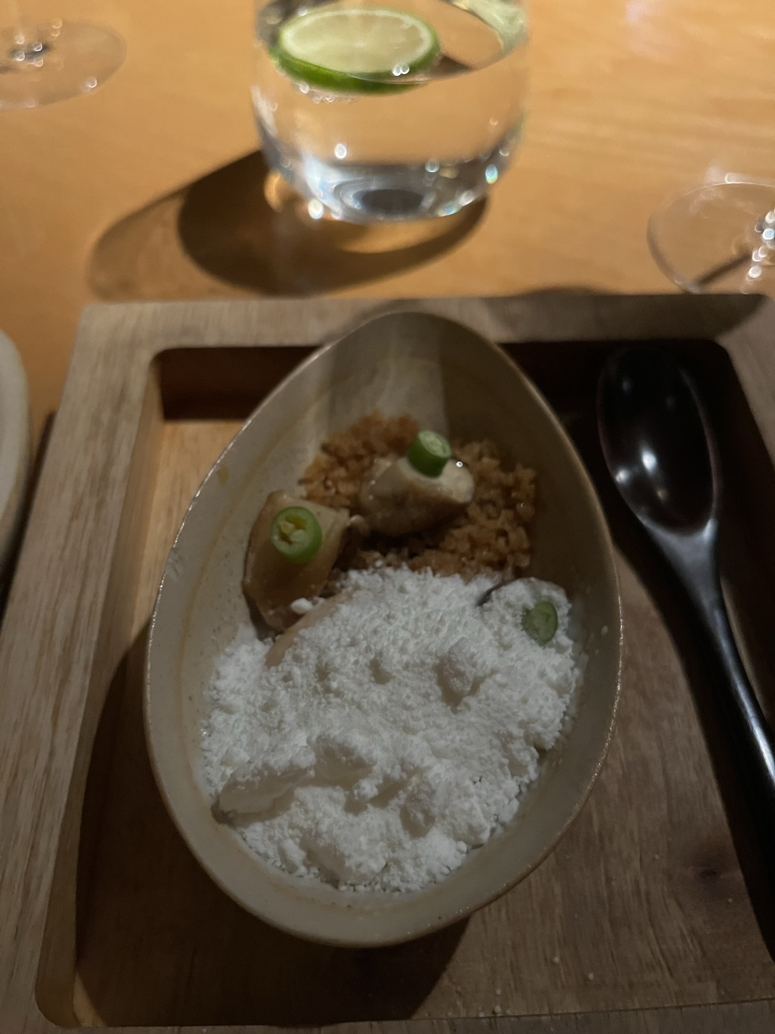두번째코스는 홍합 dolma! 다진 고기와 곡물을 가지, 파프리카 등의 야채 안에 넣은 뒤 요리하는 튀르키예의 전통음식인 dolma를 너무나 새로운 방식으로 재해석하고 있었다. 보통의 dolma 안에 들어가는 다진고기 대신 홍합을 이용해서 속을 채우고, 야채에 속을 채우는 대신 홍합껍질 모양의 바삭바삭한 타코쉘 안에 속이 담겨 나왔다. 딱 보기에 너무 홍합같이 생겼는데 가짜 홍합껍질!!ㅋㅋ 껍질까지 통채로 과자같이 바삭바삭 씹히는 식감이 너무도 새로운 기발한 메뉴였다.