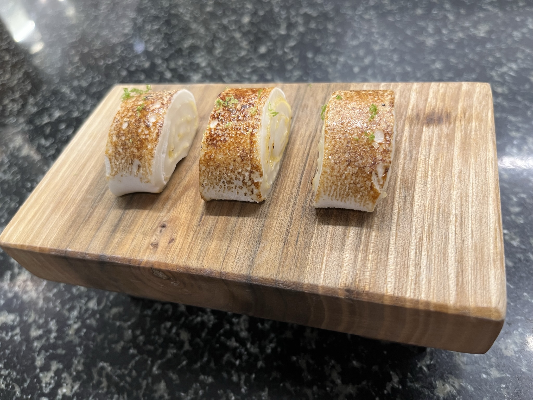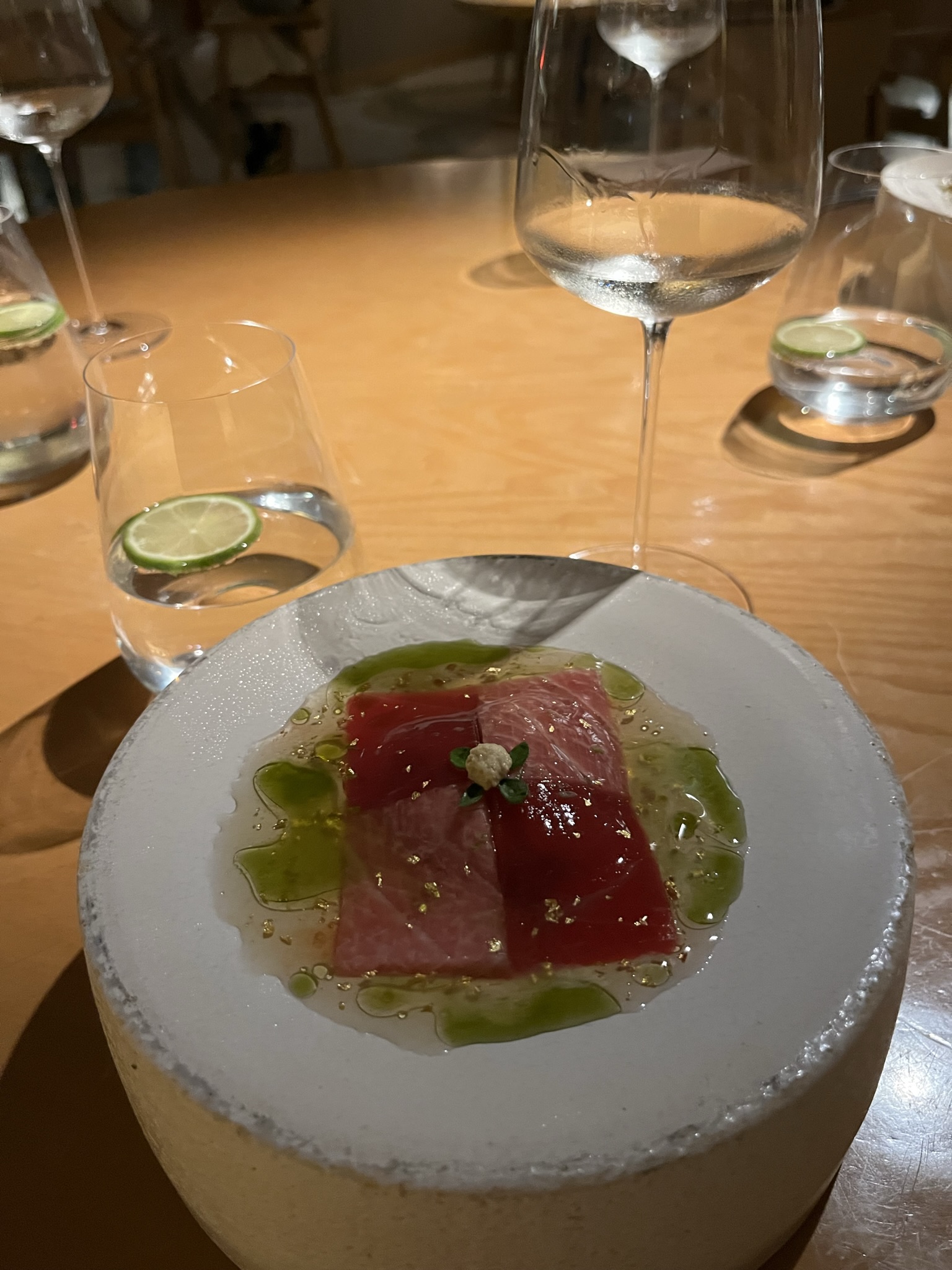 세번째 코스는 무려 애게해에서 온 참치회! 숯불구이 가지와 함께 나오는데 생각보다 너무 잘어울리는 조합이었다. 참치회인만큼 와인페어링은 와인이 아닌 사케와 페어링이 되어 나온다. 하지만 사케도 와인잔에 나와서 와인페어링인척을 하고있다ㅋㅋ 튀르키예에서 사케를 마실줄이야ㅋㅋ