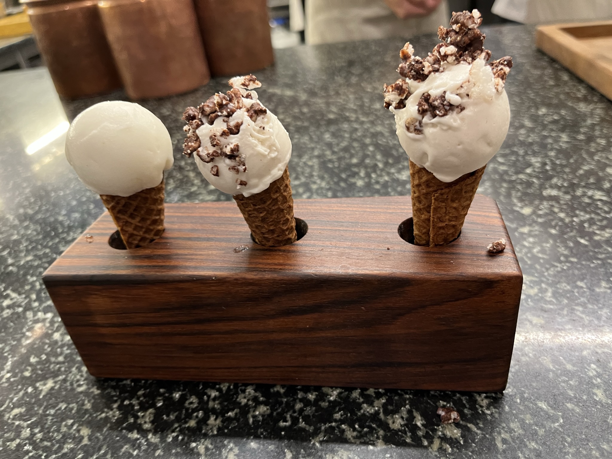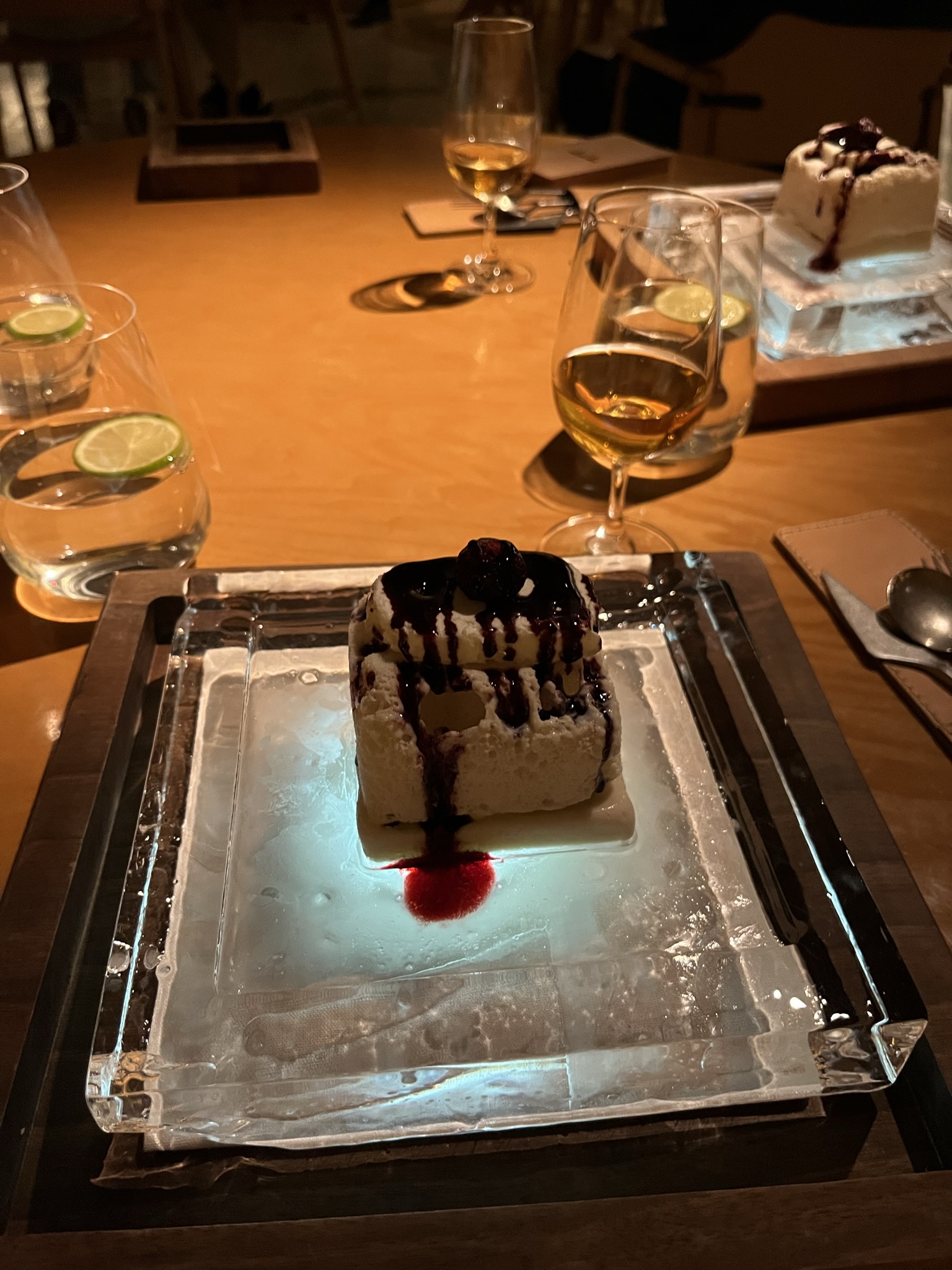 드디어 제 2막의 마지막 코스인 첫번째 디저트! (제 3막부터는 계속 계속 계속 디저트가 또나왔다 ㅋㅋㅋ) 메뉴 이름이 너무 웃긴데.. 체리 인공지능 카다이프. 체리소스를 곁들인 아이스크림에 더 가까운 카다이프 디저트를 어떻게 플레이팅할지 인공지능에게 물어봤다고 한다.. 물론 챗지피티에게 물어봤겠지 ㅋㅋ 인공지능이 추천해준 그대로 만든 빛이 반짝반짝 빛나는 얼음 그릇에 서빙되어 나온다 ㅋㅋ 맙소사.. 인공지능이 메뉴에 들어가있는걸 보게 될줄이야ㅋㅋ 그런데 먹는동안 얼음그릇이 조금씩 녹아서 별로였다.. 역시 인공지능은 그대로 믿으면 절대 안된다ㅋㅋ 와인페어링은 Kirklareli산 달콤한 소비뇽 블랑.