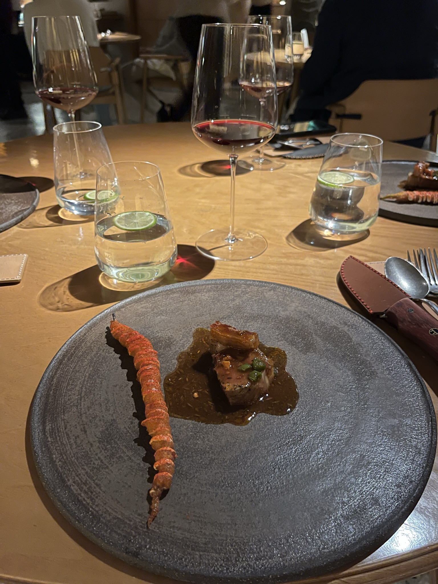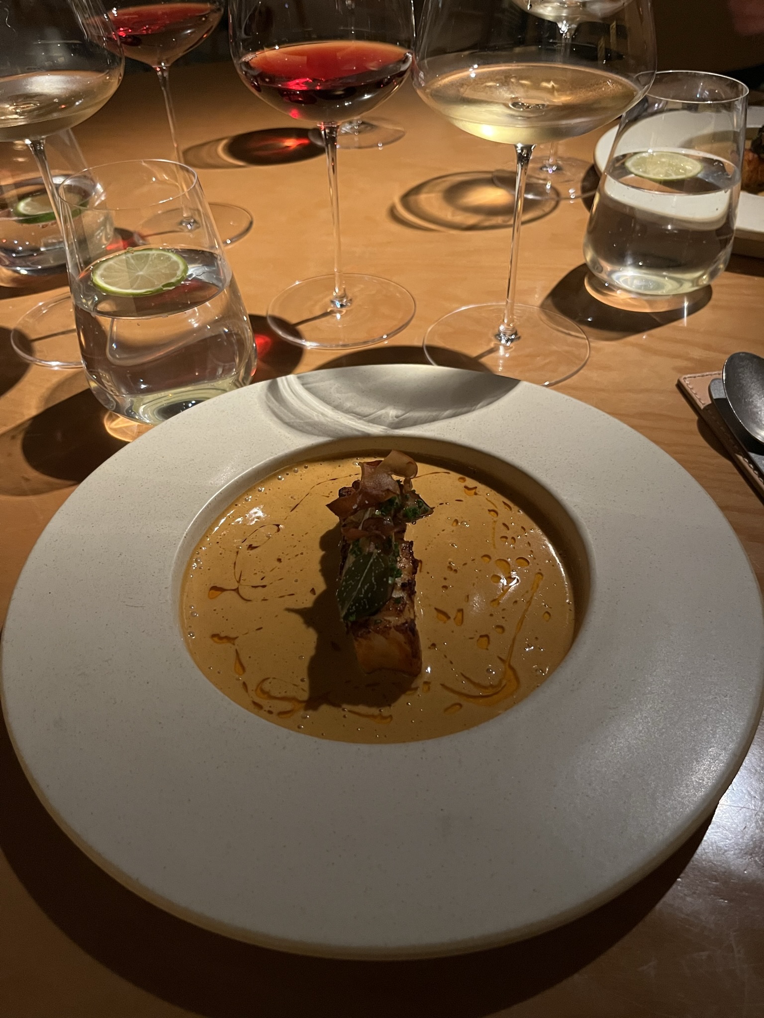 그 다음은 튀르키예의 양고기구이! 함께 나온 고추튀김과 함께 먹는게 예술이었다. 튀긴 고추튀김위에 뿌려진 요거트크림도 굿! 튀긴 고추튀김은 튀르키예의 전통 음식중의 하나인 코코레치에 영감을 받은 요리였다. 와인페어링은 Aydin산 시라와인! 양고기의 묵직한 맛을 잘 잡아주었다.
