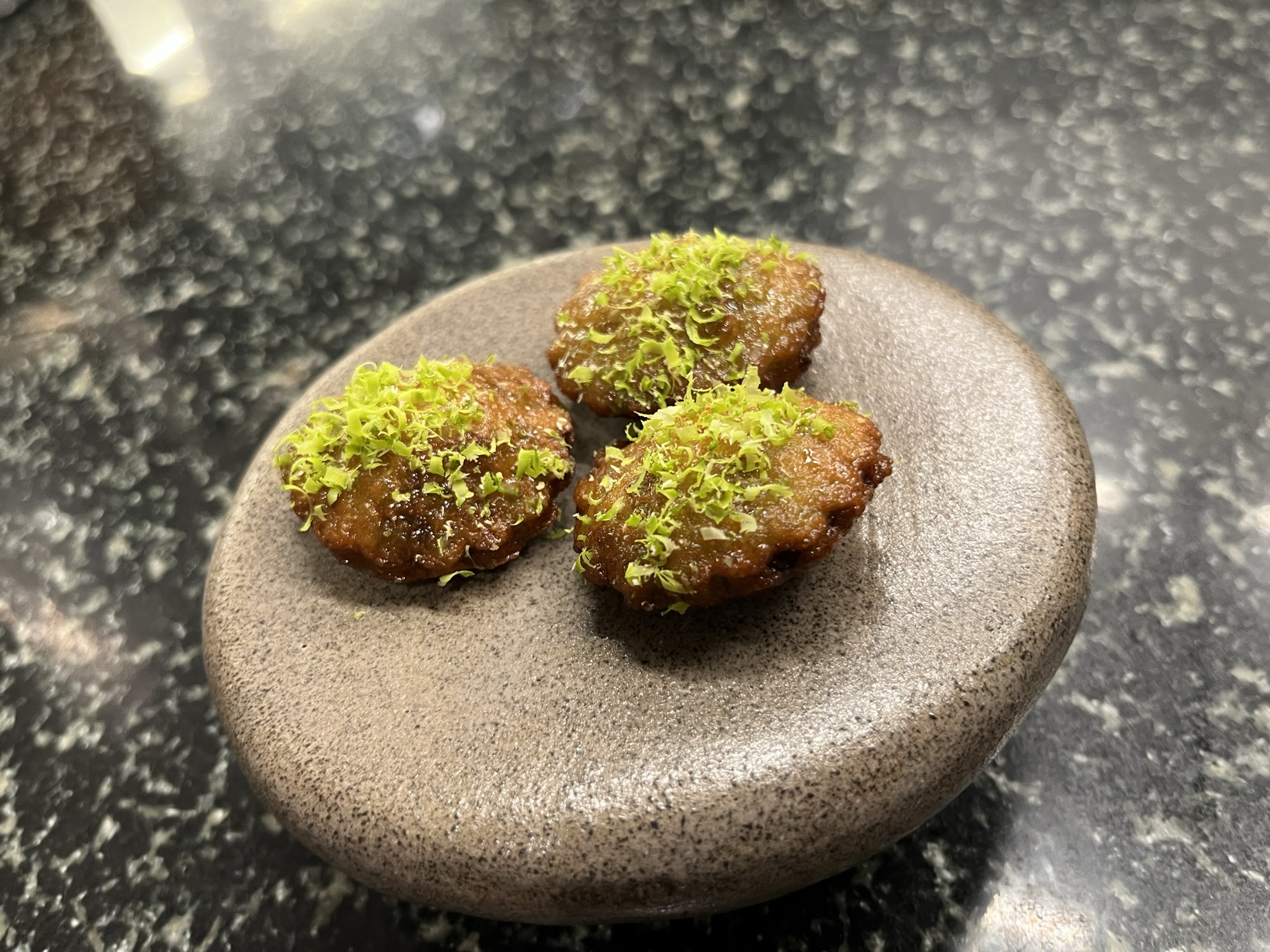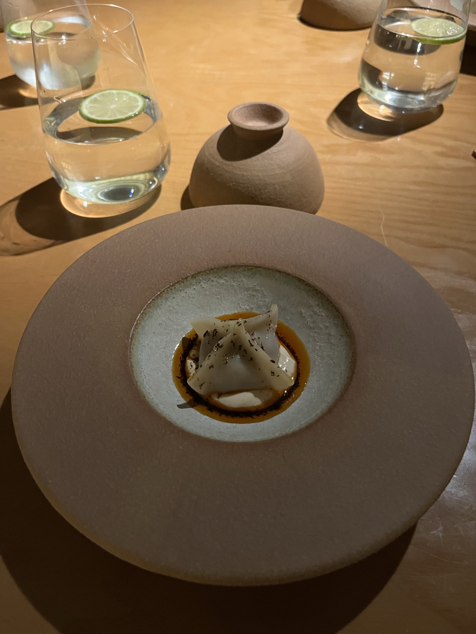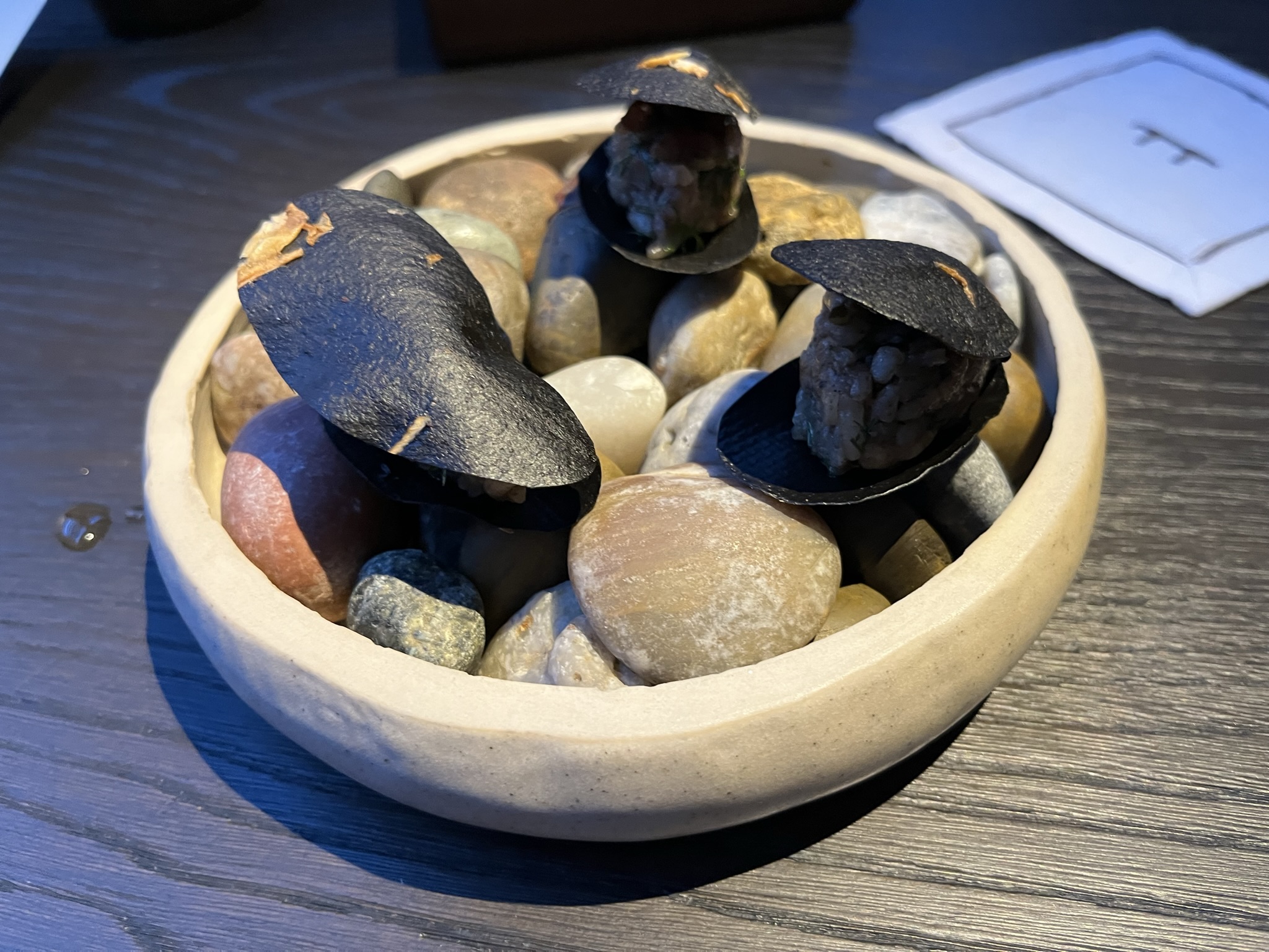 두번째코스는 홍합 dolma! 다진 고기와 곡물을 가지, 파프리카 등의 야채 안에 넣은 뒤 요리하는 튀르키예의 전통음식인 dolma를 너무나 새로운 방식으로 재해석하고 있었다. 보통의 dolma 안에 들어가는 다진고기 대신 홍합을 이용해서 속을 채우고, 야채에 속을 채우는 대신 홍합껍질 모양의 바삭바삭한 타코쉘 안에 속이 담겨 나왔다. 딱 보기에 너무 홍합같이 생겼는데 가짜 홍합껍질!!ㅋㅋ 껍질까지 통채로 과자같이 바삭바삭 씹히는 식감이 너무도 새로운 기발한 메뉴였다.