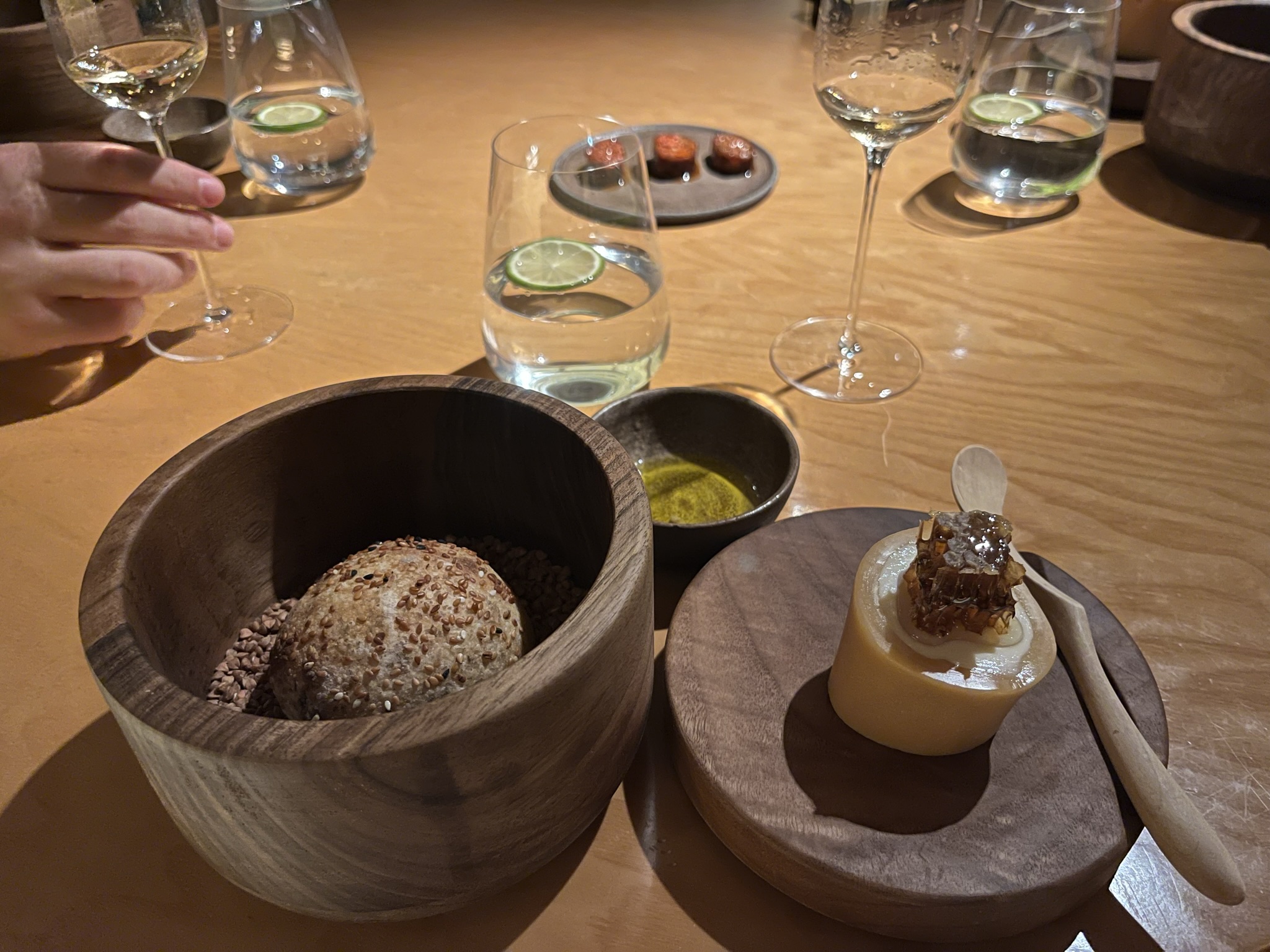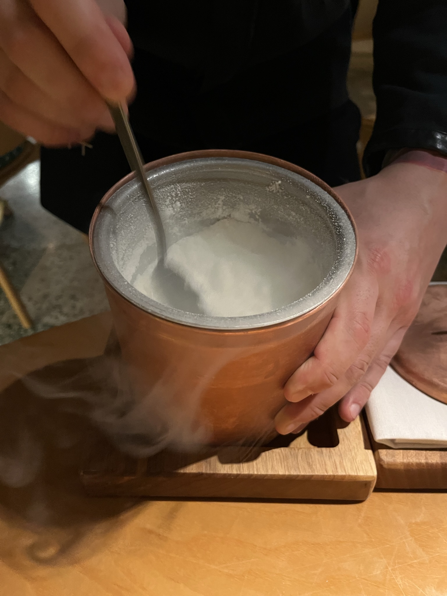 드디어 제 2막의 마지막 코스인 첫번째 디저트! (제 3막부터는 계속 계속 계속 디저트가 또나왔다 ㅋㅋㅋ) 메뉴 이름이 너무 웃긴데.. 체리 인공지능 카다이프. 체리소스를 곁들인 아이스크림에 더 가까운 카다이프 디저트를 어떻게 플레이팅할지 인공지능에게 물어봤다고 한다.. 물론 챗지피티에게 물어봤겠지 ㅋㅋ 인공지능이 추천해준 그대로 만든 빛이 반짝반짝 빛나는 얼음 그릇에 서빙되어 나온다 ㅋㅋ 맙소사.. 인공지능이 메뉴에 들어가있는걸 보게 될줄이야ㅋㅋ 그런데 먹는동안 얼음그릇이 조금씩 녹아서 별로였다.. 역시 인공지능은 그대로 믿으면 절대 안된다ㅋㅋ 와인페어링은 Kirklareli산 달콤한 소비뇽 블랑.