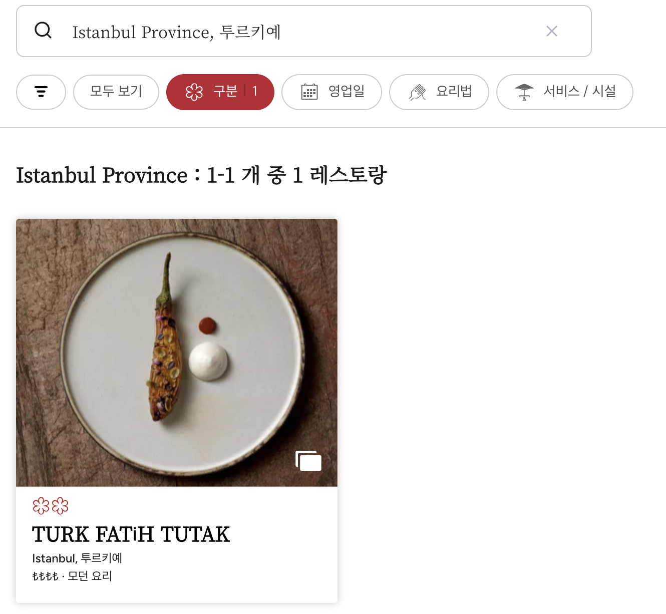 이스탄불의 유일한 미쉐린 2스타 레스토랑인 TURK FATiH TUTAK! 2024년 현재, 이스탄불에는 미쉐린 3스타 레스토랑이 없기때문에, 현재 미쉐린 가이드에 소개된 레스토랑들 중 단연 최고라고 할 수 있다. 쉐프 Faith Tutak의 튀르키예 땅에서 자라고 나는 신선한 재료들에 대한 사랑을 담아 모던하게 재해석한 튀르키예 음식을 요리하고 있다. 2023년에 처음으로 미쉐린 2스타로 선정되어, 2023년, 2024년 2년째 미쉐린 2스타를 지키고 있다.