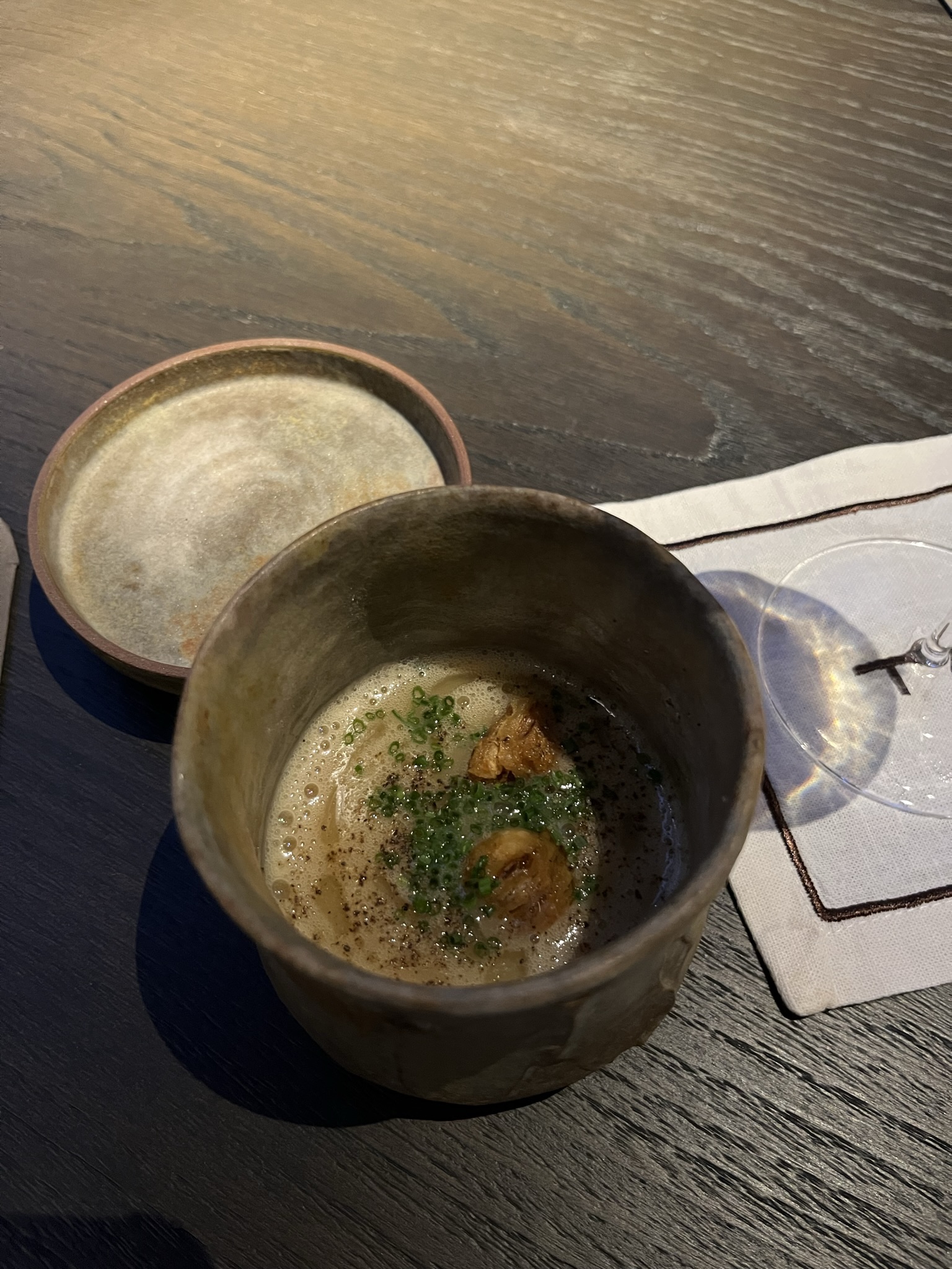 네번째 코스는 치킨스프였다. 단순할 것 같은 치킨스프. 그러나, 깊은 맛이 매우 풍부하고, 치킨껍질만 따로 튀겨내어 스프와 바삭바삭하게 함께 먹을 수 있도록 나온 엄청난 맛의 치킨스프였다!! 이 치킨스프에서 영감을 받아 집에 와서 오랫동안 푹~~ 끓이고 졸여낸 닭백숙 국물에 치킨껍질을 튀겨서 함께 먹어봤더니, 그것만으로도 맛있었다 (요즘 흑백요리사에 빠져서 혼자 요리사 놀이중ㅋㅋ). 하긴 튀킨 치킨껍질이 들어갔는데 맛이 없을수가 있겠는가ㅎㅎ 닭껍질은 진리!