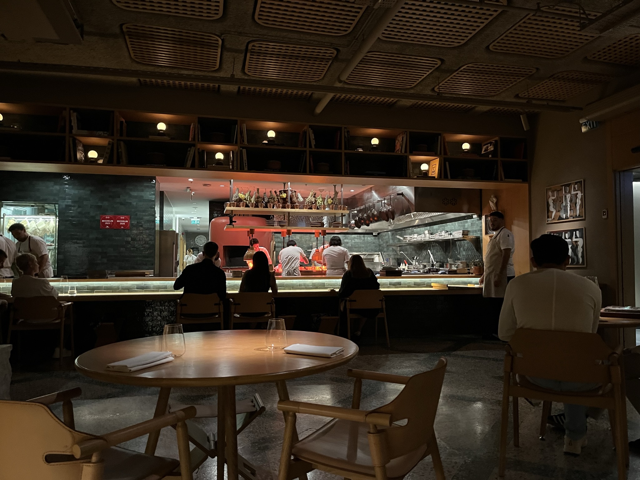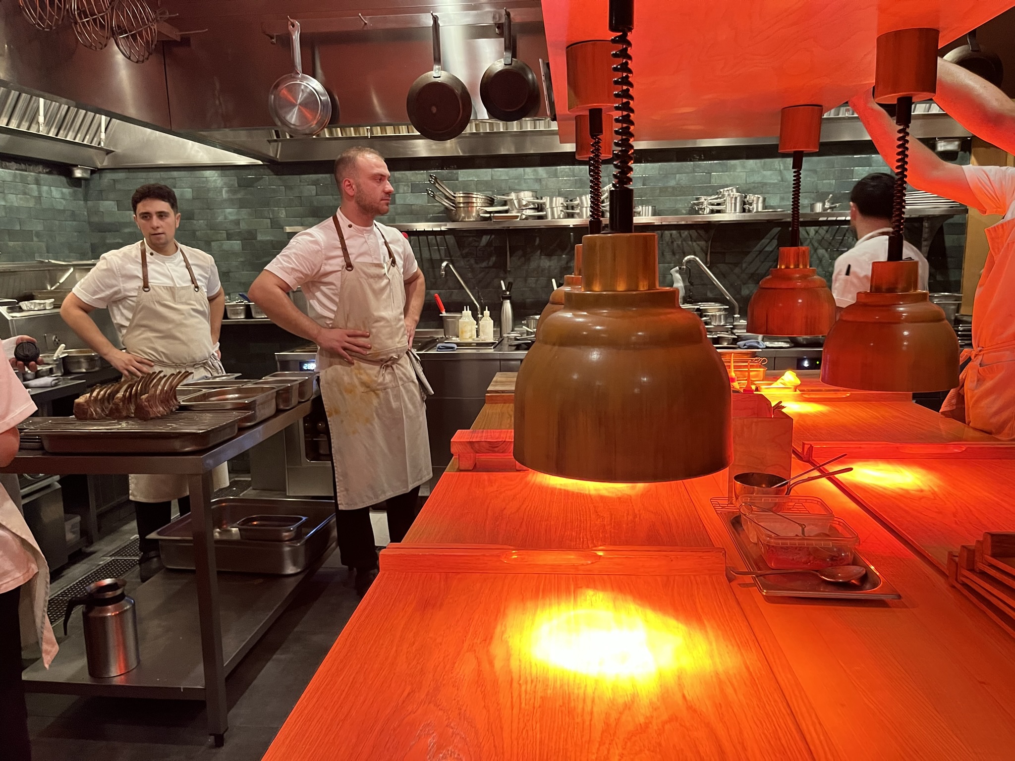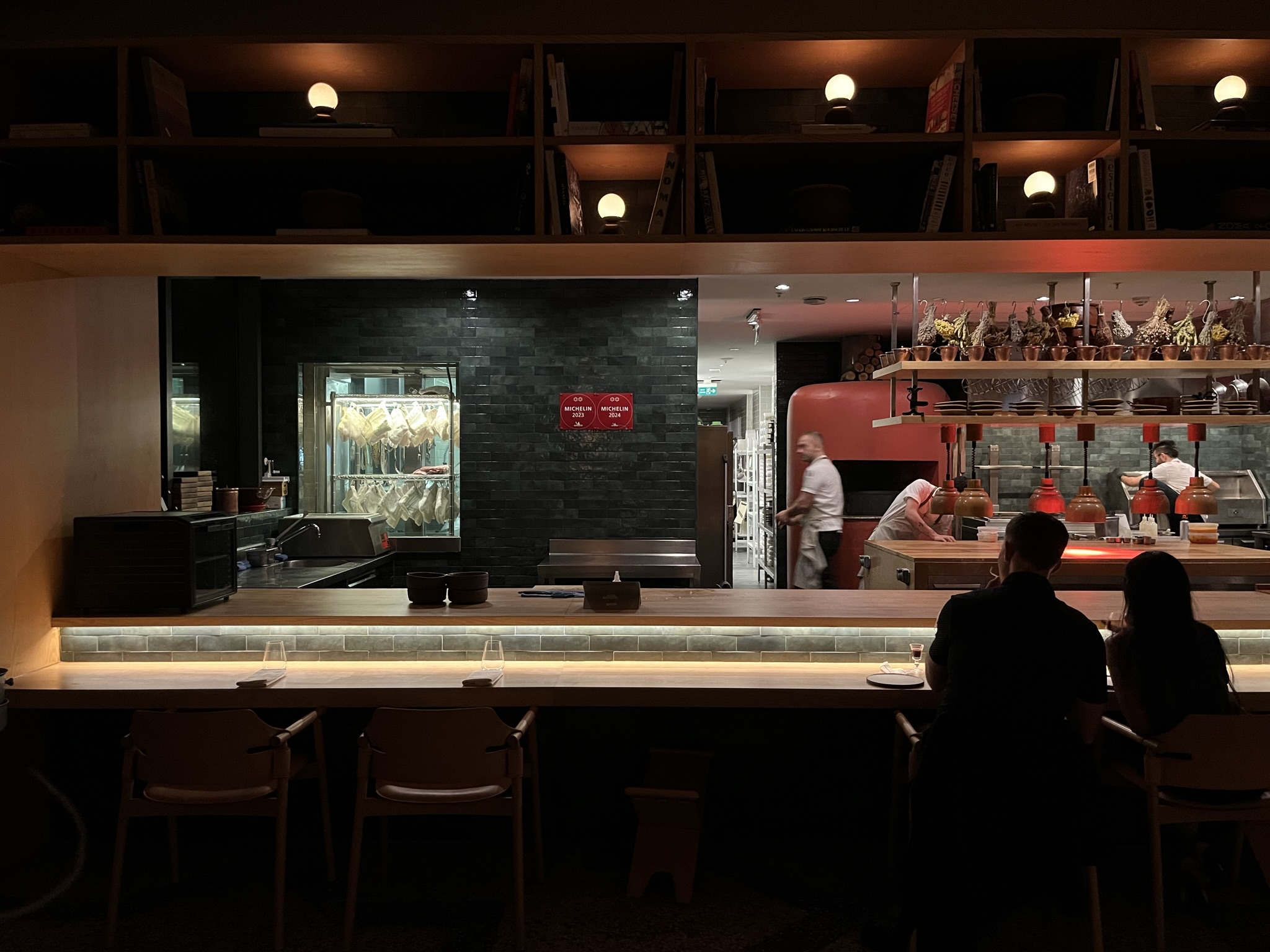컵에 담긴 치킨스프를 마시고 나면, 라운지에서 메인 다이닝홀로 안내를 받게 된다. 라운지 뒤쪽으로 문이 열리고, 메인 다이닝홀이 문 뒤로 나타나며, 완전히 다른 공간으로 넘어가는 느낌! 메인 다이닝홀은 오픈키친 형태로 다이닝을 하며 쉐프들이 요리하는 모습과 에너지를 직접 느낄 수 있는 공간이었다.