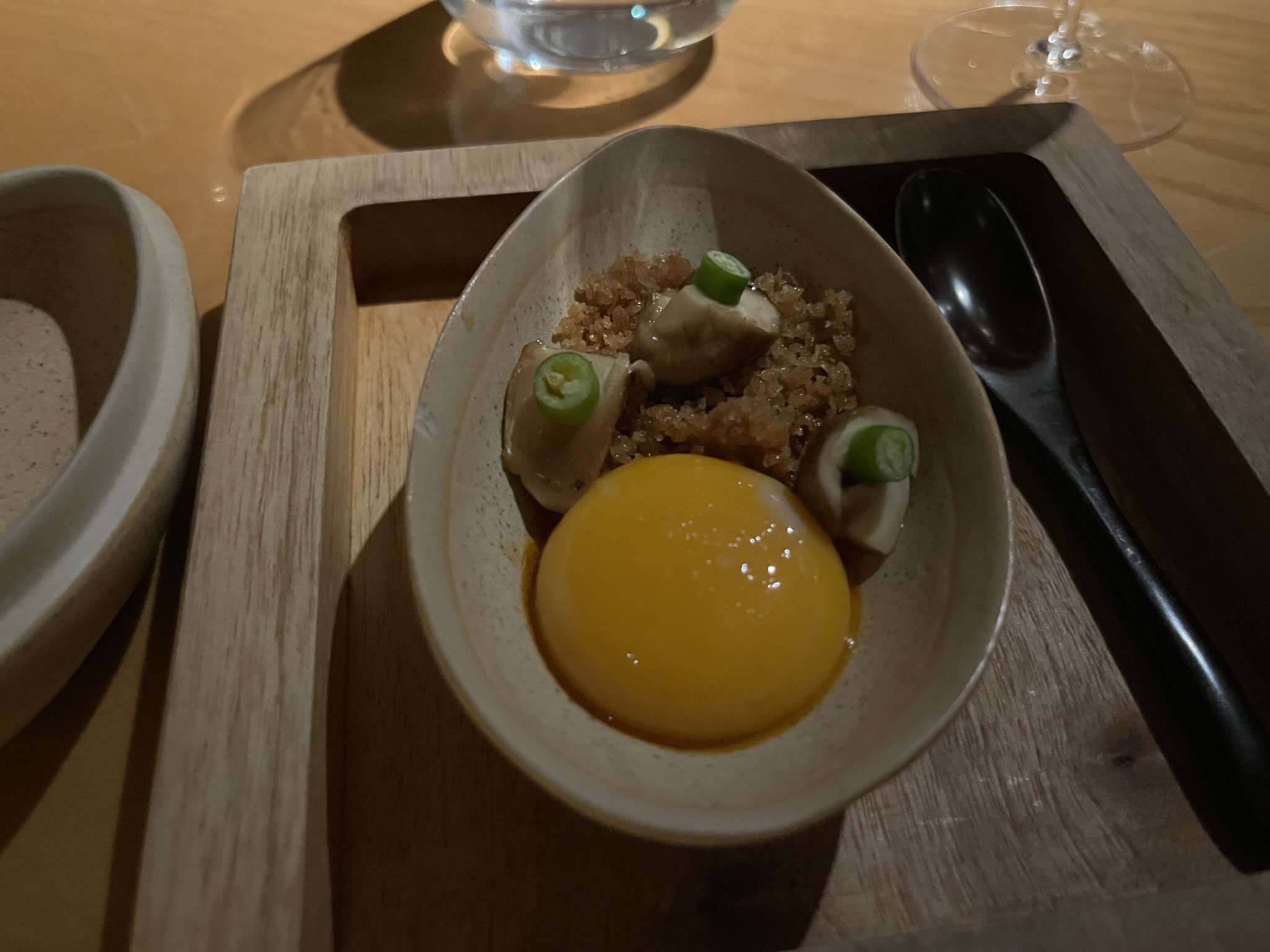 제 2막의 첫번째 코스는 6년 숙성된 치즈를 날계란 위에 올려 버섯과 같이 먹는 요리! 6년 숙성된 치즈가 드라이아이스같이 차가운 통에 담겨 나온다. 와인페어링은 카파도키아산 샤도네.
