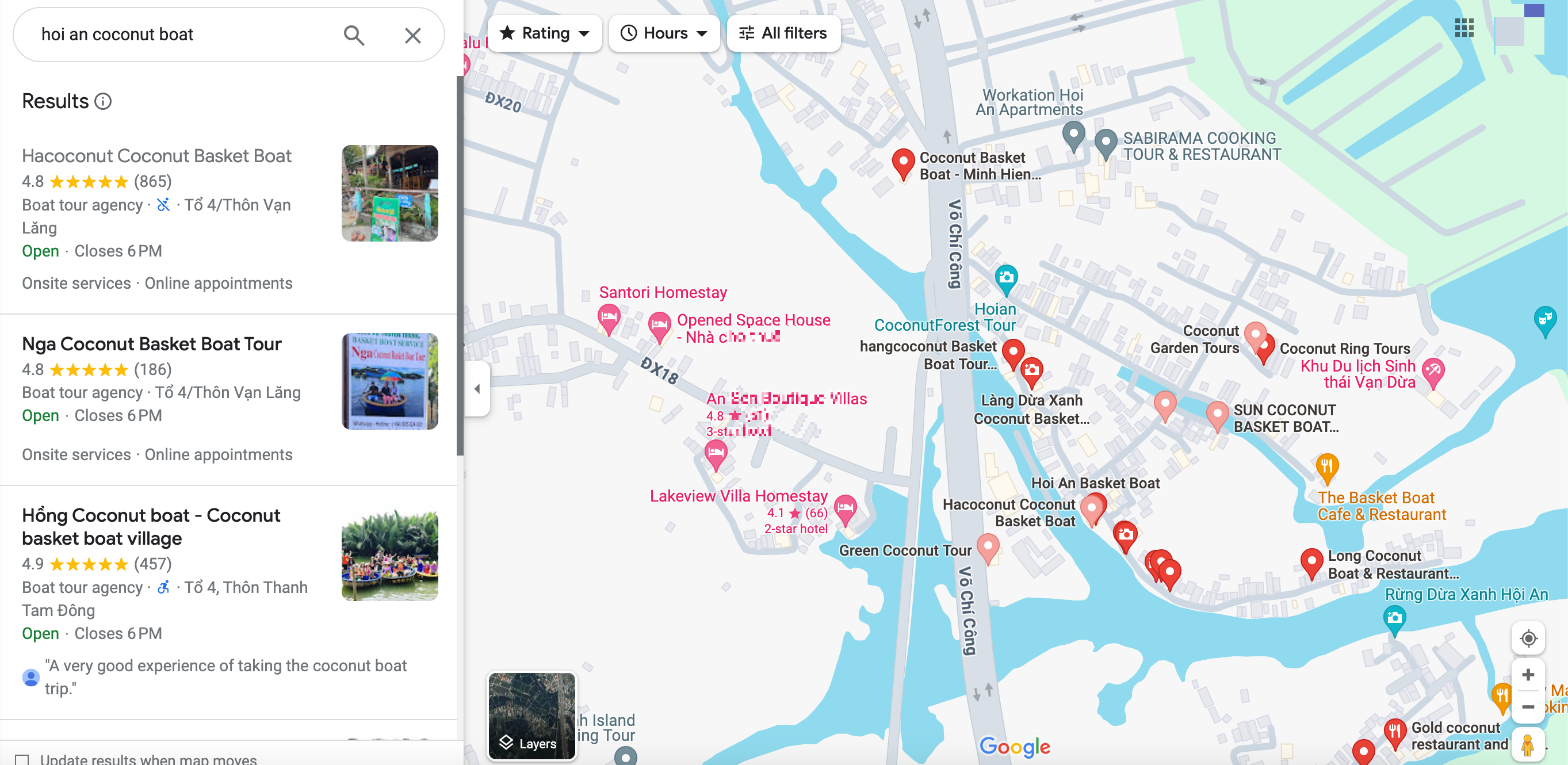 현지 업체를 찾아서 직접 투어를 예약하기 위해 구글맵에 hoi an coconut boat 라고 검색하면 이렇게나 많은 투어 업체들이 나오는 것을 볼 수 있다!!
