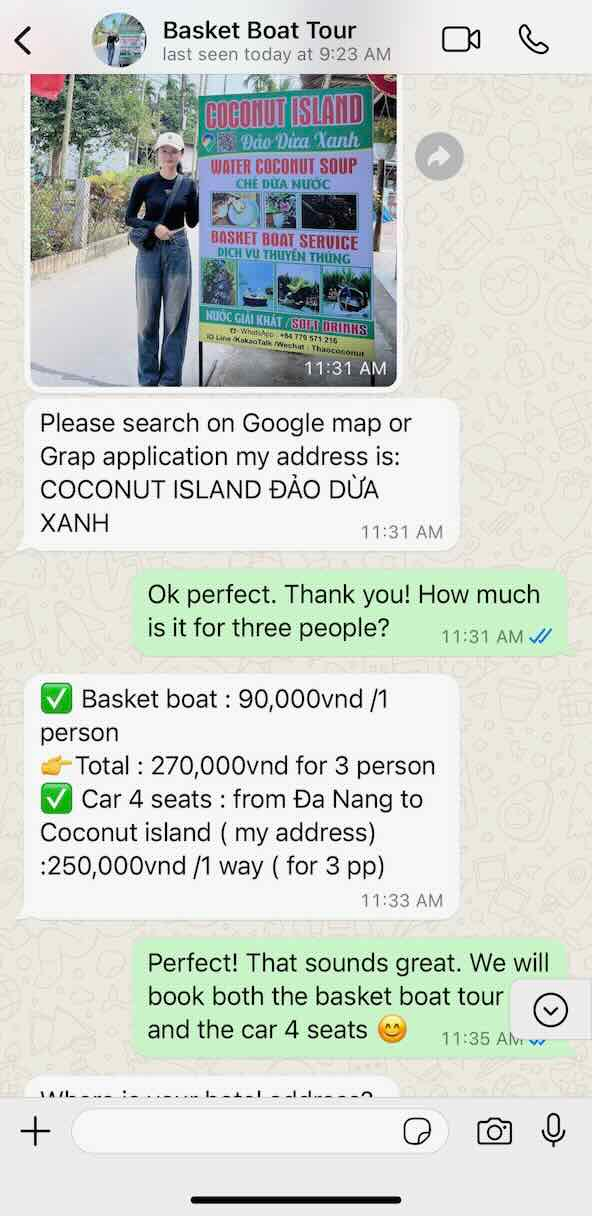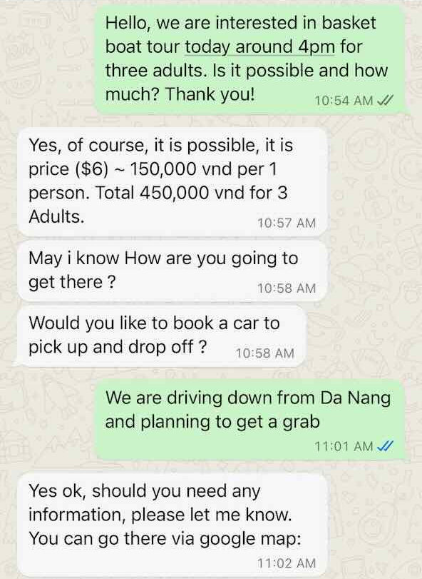 다행히도, 다른 평점 높은 다른 업체에 연락하니, 구글 리뷰에 나와있는 것처럼 정해진 가격대로 받고, 나중에 팁을 요구한다거나 등의 숨겨져 있는 가격도 없었다!! 심지어, 다낭에서 보트 탑승장이 있는 호이안까지의 택시비도 그랩보다 저렴한 가격인 250k (그랩은 편도 300k가 조금 넘는다!)으로 연결해 주었다. 투어 자체도 매우 만족스러웠고 가격도 투명하고 - 개인 자유여행으로 호이안 코코넛 보트 투어를 하고 싶지만, 호갱님이 되고 싶지 않은 분들에게 매우 강추하는 업체이다!! 구글맵에 나와있는 번호를 통해서 WhatsApp을 통해 연락해서 투어를 예약할 수 있다.