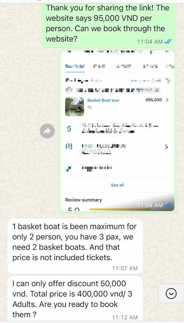 놀랍게도, 구글 리뷰가 꽤 좋은 업체들 중에서도 직접 연락했을 때 웹사이트에 나와있는 가격과 다른 가격을 제시하는 경우가 있었다. 분명 웹사이트에는 인당 95k동 (5천원정도)으로 나와있는데, 직접 연락을 하니 150k동 (8천원정도)이라고 한다.. 웹사이트 스크린샷을 찍어서 보내며 웹사이트 가격이 더 저렴한데 웹사이트에서 예약할 수 있냐고 물어보니 우리는 성인 3명이어서 배가 하나 더 필요하고, 웹사이트 가격은 티켓가격을 포함하지 않는 가격이라는 궁색한 변명들을 대며 50k동 할인해서 총 400k동에 3명을 해주겠다고 한다^^ 투어 자체가 워낙 저렴한 투어이다 보니, 인당 95k 나 150k나 사실 가격적으로 큰 차이가 나는건 아니지만 이건 금액의 문제가 아니다.. 호갱이 되는 이 느낌자체가 싫은것뿐ㅋㅋ 이런 업체들은 기분나빠서 패쓰..