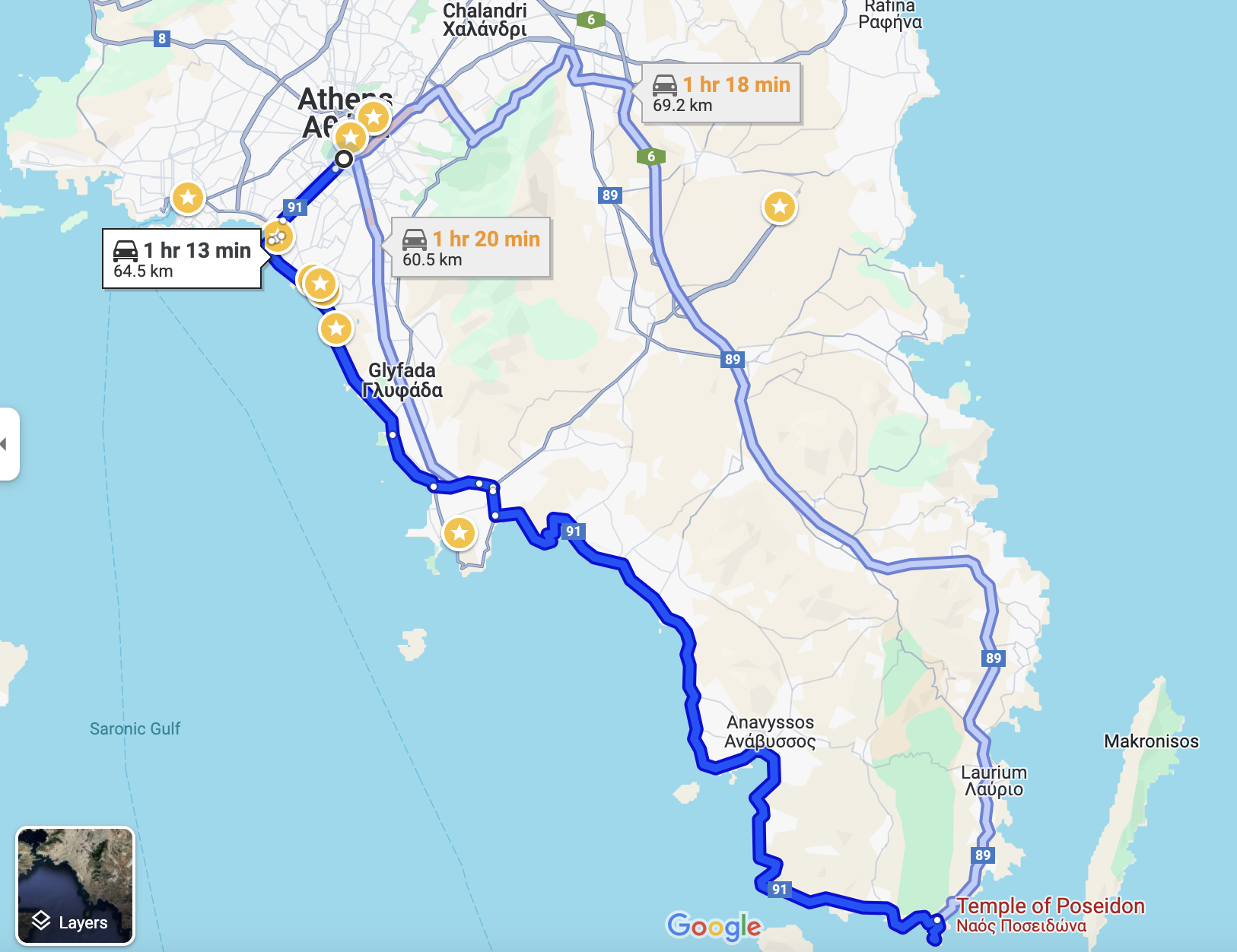 아테네 근처의 해변가 드라이브는 정말 꼭 추천한다. 섬으로 가지 않고도 그리스의 푸른 바다를 맘껏 누릴 수 있는 최고의 방법이다. 특히, 아테네에서 1시간 정도 남쪽에 위치해 있는 포세이돈 신전까지 해안가를 따라 쭉 운전해 가는 코스를 추천한다.